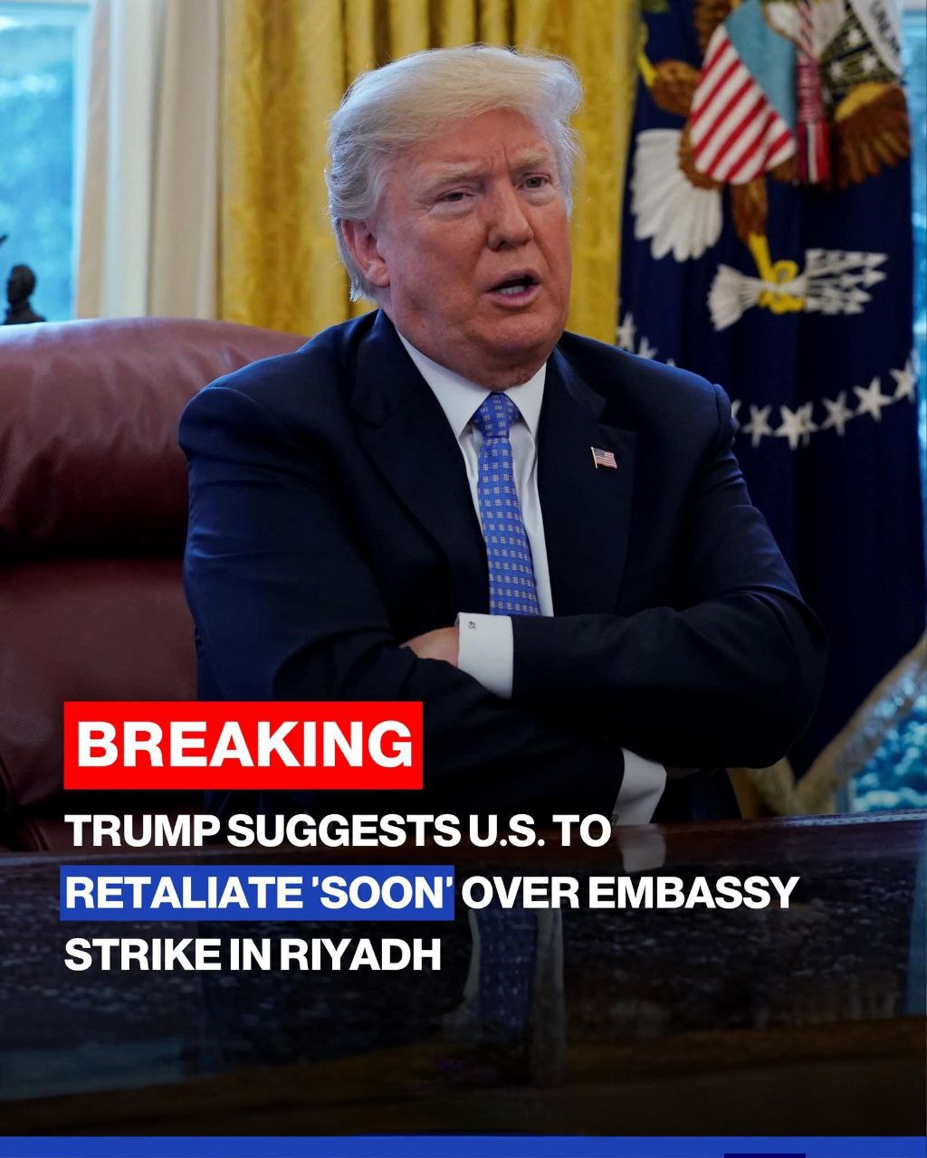 Following a drone attack on the US embassy in Riyadh that caused minor fire damage, President Trump warned that the United States would respond soon, without giving further details.