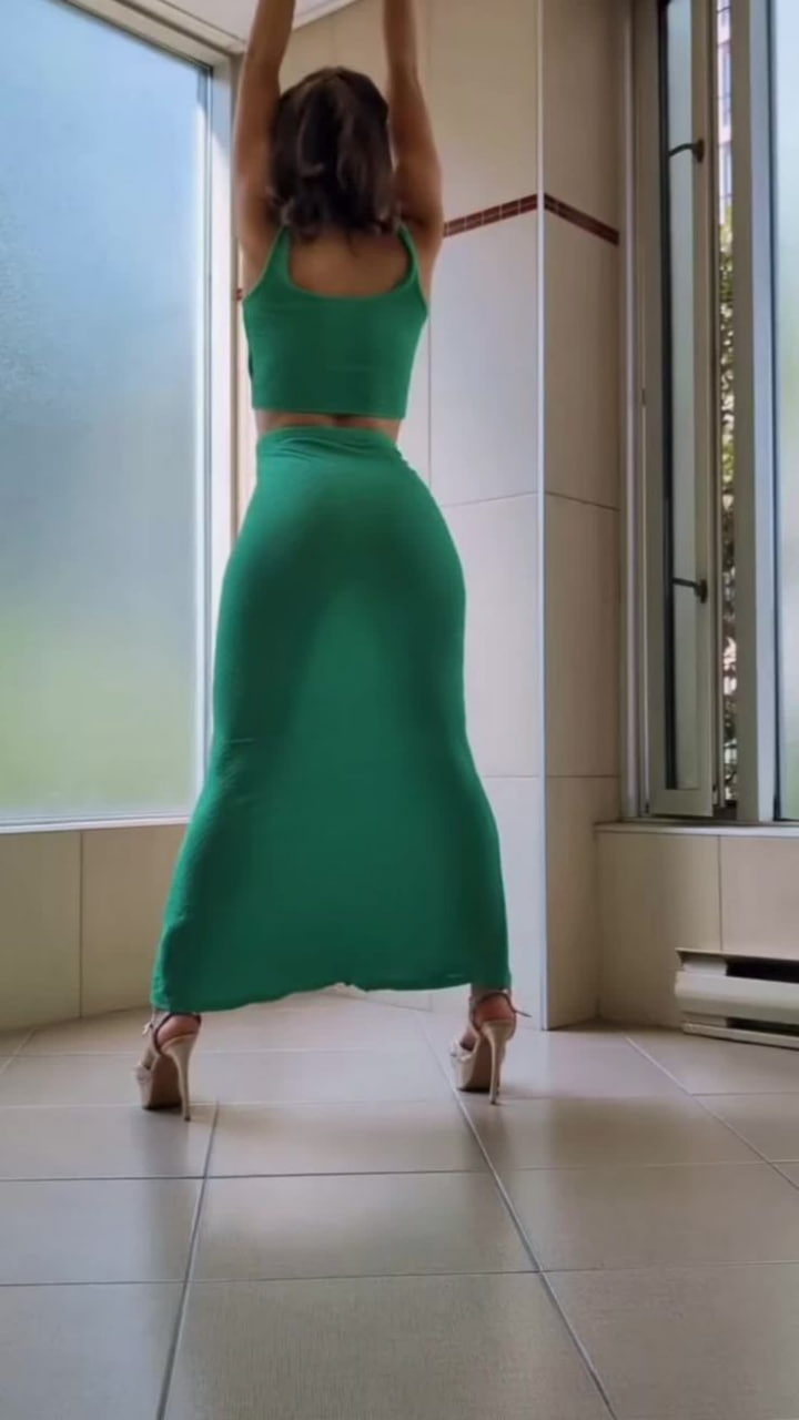 This may contain: a woman standing in a living room with her hands on her hips and looking at the camera