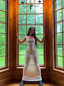 This may contain: a woman standing in a living room with her hands on her hips and looking at the camera